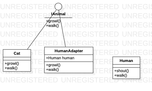 Animal interface 를 구현한 Cat class 가 있는데 Human class 와는 호환되지 않는다. 이때 Human class를 Animal interface 와 동일한 인터페이스로 동작할 수 있도록 한다.